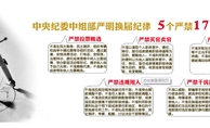 “5個嚴禁”“17”個不準”和“5個一律” “5個嚴禁”: 嚴禁拉票賄選、嚴禁買官賣官、嚴禁跑官要官、嚴禁違規(guī)用人、嚴禁干擾換屆“17個不準”: 1、不準在民主推薦、民主測評、組織考察和選舉中搞拉票等非組織活動,通過宴請、安排消費活動、打電話、發(fā)短信、當面拜訪、委托或者授意中間人出面說情、舉辦聯(lián)誼活動等形