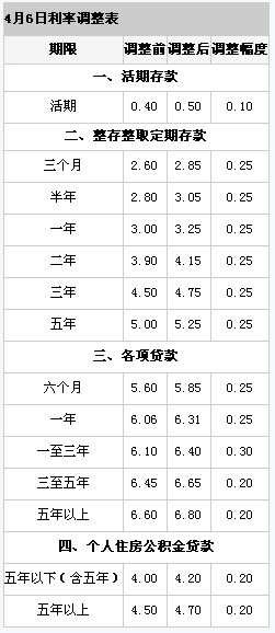 中國人民銀行決定,自2011年4月6日起上調(diào)金融機(jī)構(gòu)人民幣存貸款基準(zhǔn)利率。金融機(jī)構(gòu)一年期存貸款基準(zhǔn)利率分別上調(diào)0.25個百分點,其他各檔次存貸款基準(zhǔn)利率及個人住房公積金貸款利率相應(yīng)調(diào)整(見附表)。